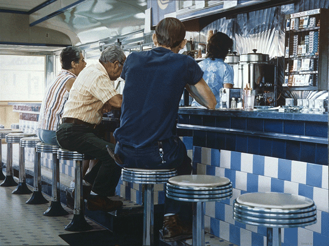 Ralph Goings is one of the founders of Photorealism, he’s known for his paintings of diner interiors and other still-lifes, he also works from photos. In this scene the camera’s exposure was set to capture the interior scene which caused the details outside the widow to be overcome by brightness. Of course our eyes would have been able to see those details.