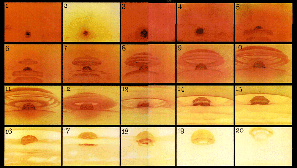“These pictures of a nuclear blast were produced by an unusual type of film; nuclear explosions vary enormously in brightness, from the radiance of a thousand suns to the dimness of a luminous watch dial, a range no conventional film can record. Changes in the brightness indicate changes in temperature. To get accurate data on brightness and thus temperature during nuclear tests, Charles Wyckoff, of a research company called EG&G, Inc. devised a special film called “XR” for extended range. XR Film is comprised of three panchromatic layers: an extremely slow layer (color-coded cyan blue) to record the brightest phenomena; a medium-speed layer (magenta) for intermediate brightness; and a high-speed layer (yellow) for faint phenomena. These photographs show an explosion conducted by the AEC before the 1963 test ban treaty. The searingly hot 300,000 C fireball, recorded on the film’s slow layer at the start of the sequence, takes on-in the false-color code-a deep-bluish cast against a blood-red sky (1). As the fire-ball expands, it first (2) dims to red as it is obscured by opaque gases and then darkens again. In 5, expanding shock waves encounter moisture-laden layers of atmosphere creating rings of condensation which spread, rise and multiply. By 11, they are several miles in diameter. When the rising fireball reaches a cooler altitude, moisture freezes (14), capping the fireball with a cascade of ice. Finally, about a minute after detonation, nothing registers on the XR film but a yellow wisp (20) of radioactive cloud.”