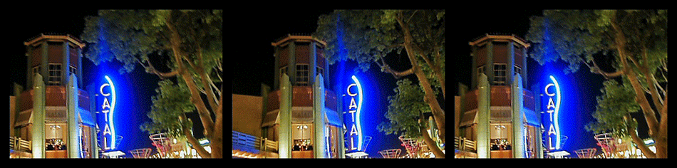 “Blue Neon”Where “Emeryville Crossover” is an experiment in weird photography that I planned and created: This image is completely accidental! I was very surprised to see that the light from the blue neon sign had this very strange effect on the camera’s sensor. The blue light came out looking like flames coming off of the sign. It may have been due to the fact that the camera was an early digital one that wasn’t up to today’s quality standards. BTW – This is the Catal restaurant in Disneyland California.