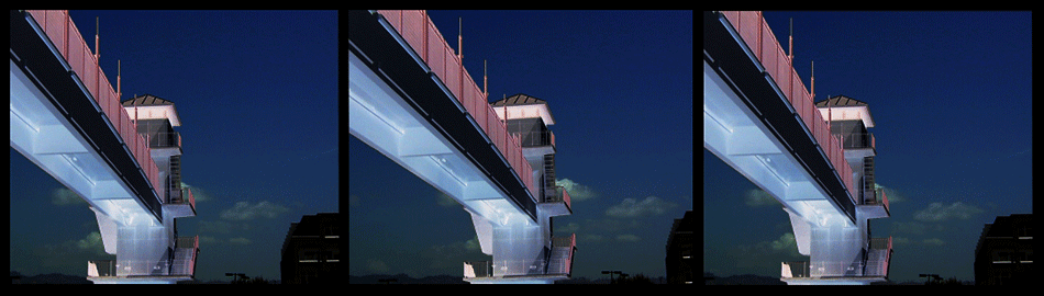 “Emeryville Crossover”An experiment in weird photography — Part of the image is a color negative and the other has been changed to look like night. The pedestrian crossover connects the Emeryville Market to the Amtrak station in Emeryville, California.