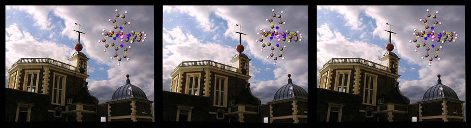 “The Royal Observatory and The Molecule”This is the famous ‘Royal Observatory, Greenwich’ where the ‘Prime Meridian’ originates. If you ever go to London make sure to include Greenwich in the sites you visit. The Observatory is very interesting and thaere are a lot more places to visit there. No, there wasn’t a giant model of a molecule floating in the air above the Observatory…I found the 3D modle of the malecule on the web.